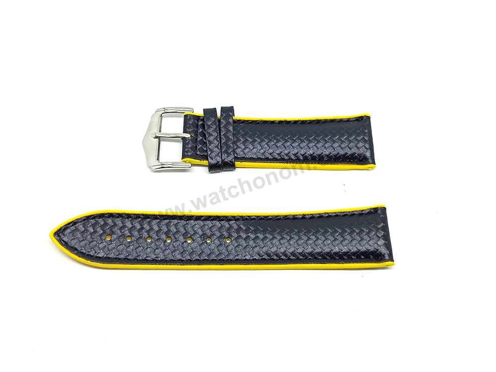 22mm Carbon Embossed Pattern Black Genuine Leather on Yellow Silicone/Rubber Replacement Watch Band / Strap